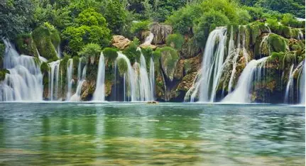Flowing waterfall in forest.